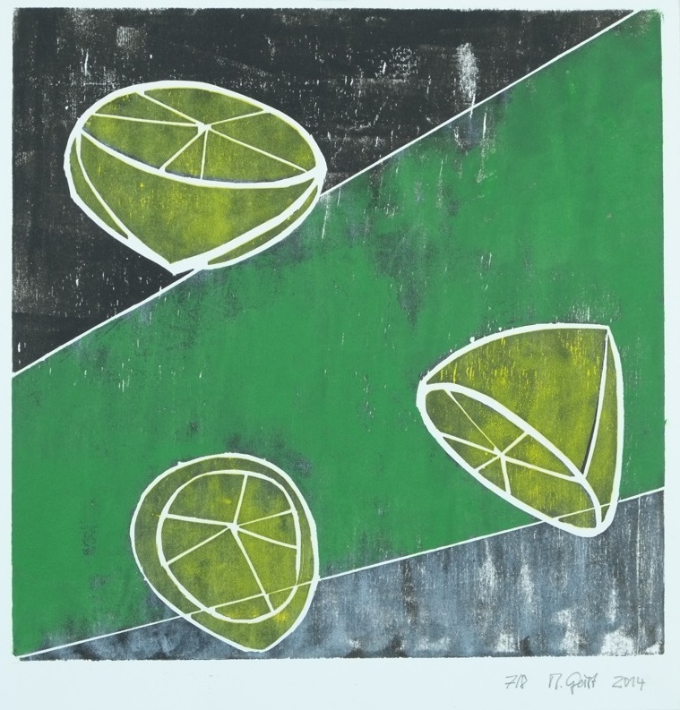 Zitronen auf Grün I, 2014 Holzschnitt auf Bütten, 32 x 32 cm Auflage: 8 (verschiedene Farbvarianten) von der Künstlerin nummeriert und signiert350,00 EUR / 420,00 SFR