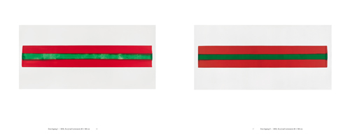 „Farbe: Grau“ ist die Publikation überschrieben, die sich auf die wesentlichen Pole im Werk der letzten vier Jahren konzentriert. Den grauen Bildern sind farbige Arbeiten auf Papier und Leinwand gleichgestellt, deren Streifen mal horizontal, mal vertikal angeordnet sind. Wie die Farben aufeinander reagieren und sich etwa voneinander absetzen, ist eine Frage ihrer Beschaffenheit. Würde man sie miteinander mischen, ergäbe es ein Grau. Alles hängt mit allem zusammen.