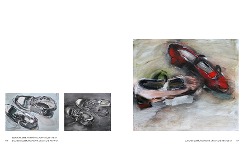 Die Dinge fanden Beate Knapp schon früh. Bereits während des Studiums an der Staatlichen Akademie der Bildenden Künste Stuttgart begann die 1952 geborene Beate Knapp gegenständlich zu malen. Und obwohl vereinzelt Menschen vorkommen und es durchaus Ausflüge in die Aktmalerei gab, widmete sie den Objekten immer die eigentliche Aufmerksamkeit in ihrem Werk, in das die Kunsthistorikerin und ehemalige Leiterin des Ulmer Museums Brigitte Reinhardt einführt. Entgegen der klassischen Stilllebenmalerei arrangiert Beate Knapp ihre Sujets nicht dekorativ auf Tischen, sie isoliert sie und bildet das jeweilige Objekt auf neutralem Grund ab. Ihr Farbspektrum ist konzentriert: Grautöne, ein reduziertes Weiß, Schwarz, manchmal Akzente in Rot oder Grün. Oder proben hier etwa die Dinge den Aufstand, wie Clemens Ottnad – Erich Kästner zitierend – andeutet. Die Gegenstände – Polaroidkameras, Schreibmaschinen, Staubsauger oder immer wieder Damentaschen und später Ballerinas – taugen nicht zur metaphysischen Aufladung. Es sind Objekte, mit denen wir uns umgeben, an denen wir manchmal Spuren hinterlassen. Doch für Beate Knapp sind es vor allem Malanlässe. Knapp, die in Achern und Berlin lebt und arbeitet, ist – auch wenn ihre Handschrift rasch ist – eine sorgfältige Malerin, die ihr Motiv auf der Leinwand entstehen lässt. Der eigentliche Tribut wird hier den Dingen gezollt, die eine große Bühne bekommen.
