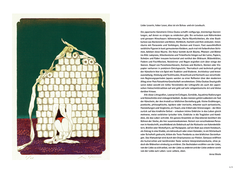 Anlässlich ihrer ersten Ausstellung in der Schweiz, im Kabinett des Museum Franz Gertsch, erscheint die Publikation der jungen japanischen Künstlerin Chika Osaka (*1984) mit Abbildungen ihrer aktuellen und teilweise für die Ausstellung neu entstandenen Lithografien und Arbeiten auf Papier. Mit Humor und Detailvielfalt ziehen sie den Betrachter ins Bild. Chika Osakas künstlerisch und technisch herausragende Werke sind eine Liebeserklärung an all diejenigen, ganz normalen Menschen, die sich der Banalität und Langeweile ihres Alltags entgegen stellen. Eine Hommage, die in ihren Motiven wiederzufinden ist, in denen menschliche Figuren, oft Protagonistinnen, die Hauptrollen spielen. In ihrer Heimat ist Chika Osaka eine der besten Lithographie- und Aquarellkünstlerinnen der Gegenwart sowie eine der populärsten jungen Künstlerinnen Japans.