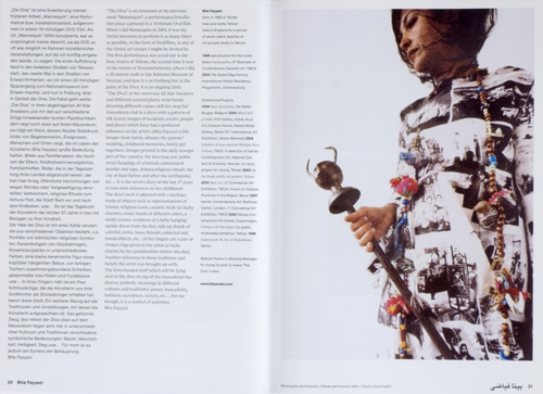 Wer an Iran denkt, dem fällt unweigerlich der Atomstreit, die Leugnung des Holocaust durch den iranischen Präsidenten Mahmud Achmadinedschad ein und ähnlich politisch brisante Themen mehr. Doch wie leben die Menschen in Iran, wie nehmen sie ihren Alltag wahr, was sind ihre Probleme? Diese Fragen spiegelt die Tagespolitik nicht wider. Die Kunst schon. „iran.com“ versteht sich daher als Brücke zwischen Iran und Deutschland und ist die erste umfangreiche Ausstellung in einem deutschen Museum, die das zeitgenössische Kunstschaffen in Iran reflektiert. Äußerer Anlass dafür war die seit dem Jahr 2000 bestehende Städtepartnerschaft zwischen Isfahan und Freiburg, innerer die Notwendigkeit genauer hinzusehen. Diesen Blick hinter die Klischees ermöglichen Künstlerinnen und Künstler wie die beiden Biennale-Teilnehmerinnen Bita Fayyazi und Mandana Moghaddam, mit ihren oftmals sehr symbolhaften Performances, Fotos und Videos. Aber auch Barbad Golshiri, Sohn des kritischen Intellektuellen Housang Golshiri, der mit seinen Projekten in den öffentlichen Raum der Islamischen Republik eindringt. Mehr und mehr hat sich das Internet zu einem virtuellen Ort einer solchen Gegenöffentlichkeit entwickelt. Der Titel „iran.com“ spielt darauf an. Es mag schizophren wirken, dass neben einem reglementierten öffentlichen Raum weitere, durchaus liberalere Lebensformen möglich sind. Doch die Kunst war immer Teil dieser Dualität. Die Künstlerinnen und Künstler sind: Mahmoud Bakhshi-Moakhar, Bita Fayyazi, Shahab Fotouhi / Neda Razavipour, Barbad Golshiri, Ramin Haerizadeh, Rokni Haerizadeh, Khosrow Hassanzadeh, Minoo Iranpour, Simin Keramati, Afshan Ketabchi, Majid Koorang Beheshti, Akbar Mikhak, Mandana Moghaddam, Ahmad Morshedloo, Farhad Moshiri / Shirin Aliabadi.
