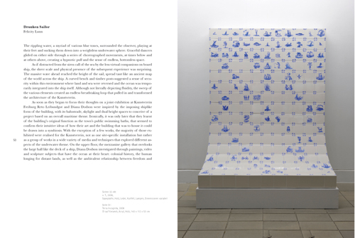 Wer im April und Mai 2008 den Kunstverein Freiburg nichts ahnend betrat, wird nicht schlecht gestaunt haben. Brach sich doch an der Stirnseite der Galerie nicht nur eine überdimensionale Welle, sondern auch eine Ausstellung Bahn, die dem Betrachter auf große Fahrt übers Meer nahm. Denn jede der Arbeiten von Diana Dodson und Reto Leibundgut gemeinsamer Schau „Drunken Sailor“ fügte der Metapher Wasser eine weitere Nuance zu. „Drunken Sailor“ war so Bühnenbild, Bilderrätsel und Wunderkammer zugleich. Die beiden Schweizer Künstler, die bereits bei anderen Projekten zusammengearbeitet haben, erforschen unsere ambivalente Gefühlslage zum Meer zwischen Aufbruch und Sehnsucht, Gefahr, unbegrenzter Freiheit und Kolonialismus. Dass sie sich dabei äußerst dekorativer Techniken wie der Intarsienarbeit, dem Mosaik oder der Kachelmalerei bedienen, zeigt, wie anheimelnd der Mensch gerne Elementargewalten darstellt. Diana Dodson und Reto Leibundgut ironisieren damit den menschlichen Entdeckergeist. Der reich bebilderte Katalog bietet nicht allein einen Einblick in den Kosmos von „Drunken Sailor“, er knüpft auch bei früheren Arbeiten von Diana Dodson und Reto Leibundgut an. Ein kenntnisreicher Essay von Kunstvereinsleiterin Felicity Lunn vertieft darüber hinaus diese Werkzusammenhänge.