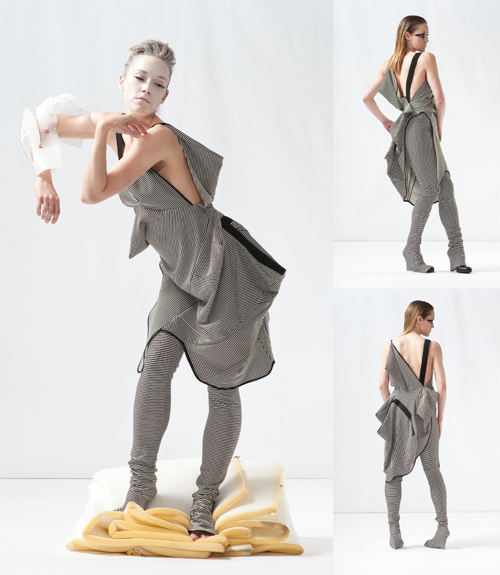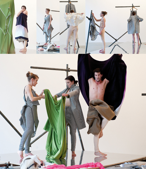 Aldona Kut hat ihre Projektkleider in ihrer Ausstellung im Kunstforum Rottweil mit Balletttänzern in sieben Sequenzen choreografisch inszeniert. Raffungen, Faltungen und ungewöhnliche Proportionen, Spannungen und Raum zwischen Haut und Mensch, verformen den Körper wie das Ballett, vielleicht befreien sie ihn aber auch zu seiner eigentlichen Form. Neben diesen Performancefotos stellt der dreisprachige Katalog auch Kuts Zeichnungen vor, die mehr Choreografien als Modeskizzen gleichen. Am Ende schaut der Leser dieses Katalogs mit Aldona Kuts Augen auf die Welt der Mode.