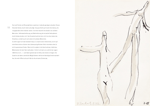 Bücher haben ihre Schicksale. Der Tod des Bildhauers und Zeichners Franz Bernhard im Jahr 2013 ließ Erich Thies mit dem lang gehegten Wunsch der beiden nach einem weiteren gemeinsamen Buchprojekt allein zurück. Das Einander, das Thies in diesem Band beschwört, weiß von verpassten Chancen und zu frühen Abschieden. Thies, der 1994 als Professor für Philosophie und Pädagogik an die Humboldt-Universität Berlin berufen wurde, ist ein unakademischer Denker. Was er in diesem kurzen Essay entwickelt, ist eine sehr lebensnahe Philosophie eines Einanders, das auf Liebe und Freundschaft beruht. Im Wechsel mit Franz Bernhards Papierarbeiten entfaltet sich auf den Seiten des Buches die Utopie von menschlichem Zusammenleben. Thies‘ Text findet seine Entsprechung in Zeichnungen von Franz Bernhard, die immer von Doppelstrukturen ausgehen, von Paaren, Menschen und abstrakten Elementen, dies nie aber als selbstverständlich nehmen. So ist dieses Buch, an dessen Anfang eine gemeinsame Idee stand, ein schönes Beispiel von Lebenskunst geworden.