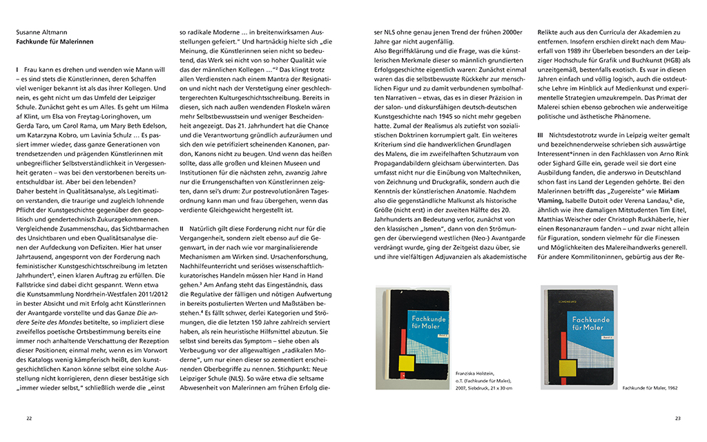 Die Publikation zur generationenübergreifenden Gruppenausstellung – die Geburtsjahre der Künstlerinnen rangieren zwischen 1958 und 1982 – zeigt sowohl figürliche Malerei Leipziger Prägung als auch die Entwicklung der Abstraktion aus ihr heraus. Mittlerweile ist bekannt, dass Leipziger Malerei nicht nur männlich ist – jedoch wird sie oft weiterhin noch als typischerweise figürlich verstanden. Bei „Fremde Mächte – Malerei aus Leipzig“ kommt nun nicht nur die weibliche Seite stärker zum Zuge, es wird außerdem noch mit diesem weiteren Vorurteil aufgeräumt. Neben bekannten Vertreterinnen des figurativen Leipziger Stils wie Rosa Loy und Katrin Brause a.k.a. Heichel zeigt das Museum Franz Gertsch auch Positionen zwischen Gegenstand und Abstraktion und bietet eine Plattform für rein abstrakte Ausprägungen, wie etwa die Werke von Henriette Grahnert und Franziska Holstein.