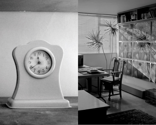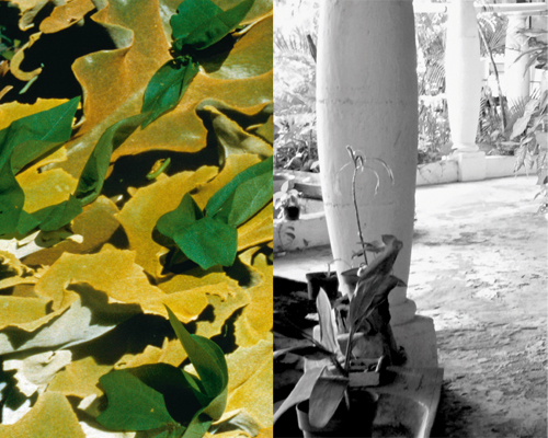 Auf einer der Fotografien von Annette Merkenthaler sieht man das Cover von Carolina Lunas Buch „Los espacios que nos ocupan“. Und wirklich sind auch die Aufnahmen der Künstlerin von Räumen, genauer von Erinnerungsorten, besetzt. Ihr Künstlerbuch „Detrás de los Jardínes. Hinter den Gärten“ geht auf ihre mehrmaligen Mexiko-Aufenthalte zurück, vor allem auf ihre Reise im Herbst 2008. In Freiburg ist im darauf folgenden Frühjahr die Serie „Bilder von mexikanischen Zement-Fußböden in meinem Garten“ entstanden. „Hinter den Gärten“ klingt geheimnisvoll, als führten dort die Pflanzen und Dinge ein verborgenes Leben. Annette Merkenthaler hat stille Räume eingefangen, Räume, die mehr ein Dazwischen als ein Draußen zu sein scheinen. Pflanzen werfen ornamentale Schatten auf Mauern, verschnörkelte Gartenmöbel erinnern an Blumen und manch seltsames Getier ist zu sehen.
