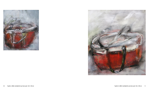 Die Dinge fanden Beate Knapp schon früh. Bereits während des Studiums an der Staatlichen Akademie der Bildenden Künste Stuttgart begann die 1952 geborene Beate Knapp gegenständlich zu malen. Und obwohl vereinzelt Menschen vorkommen und es durchaus Ausflüge in die Aktmalerei gab, widmete sie den Objekten immer die eigentliche Aufmerksamkeit in ihrem Werk, in das die Kunsthistorikerin und ehemalige Leiterin des Ulmer Museums Brigitte Reinhardt einführt. Entgegen der klassischen Stilllebenmalerei arrangiert Beate Knapp ihre Sujets nicht dekorativ auf Tischen, sie isoliert sie und bildet das jeweilige Objekt auf neutralem Grund ab. Ihr Farbspektrum ist konzentriert: Grautöne, ein reduziertes Weiß, Schwarz, manchmal Akzente in Rot oder Grün. Oder proben hier etwa die Dinge den Aufstand, wie Clemens Ottnad – Erich Kästner zitierend – andeutet. Die Gegenstände – Polaroidkameras, Schreibmaschinen, Staubsauger oder immer wieder Damentaschen und später Ballerinas – taugen nicht zur metaphysischen Aufladung. Es sind Objekte, mit denen wir uns umgeben, an denen wir manchmal Spuren hinterlassen. Doch für Beate Knapp sind es vor allem Malanlässe. Knapp, die in Achern und Berlin lebt und arbeitet, ist – auch wenn ihre Handschrift rasch ist – eine sorgfältige Malerin, die ihr Motiv auf der Leinwand entstehen lässt. Der eigentliche Tribut wird hier den Dingen gezollt, die eine große Bühne bekommen.