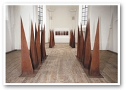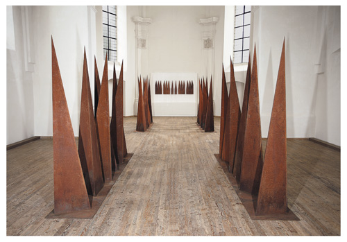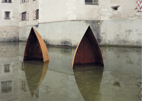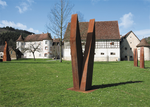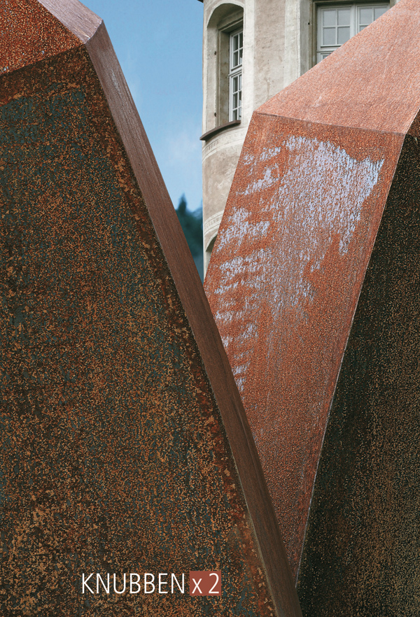 An der Form war Jürgen Knubben, der seit fünfzehn Jahren das Forum Kunst Rottweil leitet, nie ausschließ- lich interessiert. Der studierte Theologe sucht mit seinen Plastiken und Installationen immer auch eine Verortung des Menschen im Dasein und zugleich eine Verbindung von Spiritualität, Philosophie, Mathematik und Ästhetik. So hat er für die Klosterkirche Bernstein eine Anordnung von schrägen Pyramiden geschaffen, die sich auf Leonardo da Vincis Abendmahl beziehen, für die Skulpturausstellung im Kultur- und Museums- zentrum Schloss Glatt jedoch ein Formenvokabular geprägt, das Schiffe, Türme und Quader aufgreift. Jürgen Knubben schafft mit seinen rostenden Plastiken nicht nur kulturelle Grundformen, er zeigt auch, so Eugen Gomringer in seiner Hommage an den Künstler „die bilder der zukunft“.