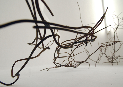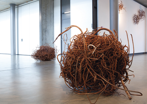 Mag sein, dass Manuela Tirlers biografische Landschaften ihren Horizont erweitert haben. Die Absolventin der Staatlichen Akademie der Bildenden Künste Stuttgart, die bei Werner Pokorny, Micha Ullman, Markus Ambach und Rainer Ganahl studierte, wuchs in den USA und im Enzkreis auf. Bezüge zu den jeweiligen Kulturlandschaften lassen sich in den Arbeiten der jungen Künstlerin finden. Sei es, dass sie bei ihrer Debütausstellung in der Ausstellungshalle der Staatlichen Akademie der Bildenden Künste Stuttgart für ihre Installation "Instant Brushwood" Schnittgut erst in stählernen Kiepen aufbewahrte, dann häckselte und schliefllich in Acrylsäulen schüttete. Sei es, dass sie in ihrer Serie "Tumbleweeds" diese Steppenläufer aus Armierungseisen durch Bagger nachformt und so dem künstlichen Material eine natürliche Gestalt verleiht. Das Werk von Manuela Tirler stehe, so Petra von Olschowski in diesem Band, im "Spannungsfeld zwischen Kunst und Natur". Beide – häufig so antagonistisch wahrgenommene Bereiche – werden wechselseitig umgedeutet und umgeformt.